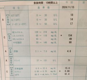 健康診断の結果 身体の事 X Facebook はてブ Pocket LINE コピー 2025.02.24 会社の健康診断の結果 予想通り、総合所見Cでした(-_-;) LDL(悪玉)コレステロールが基準値より高い・・・ 原因は脂質の多い食事、運動不足、加齢など・・・ 増えすぎると血液の流れが悪くなるらしい クレアチニン